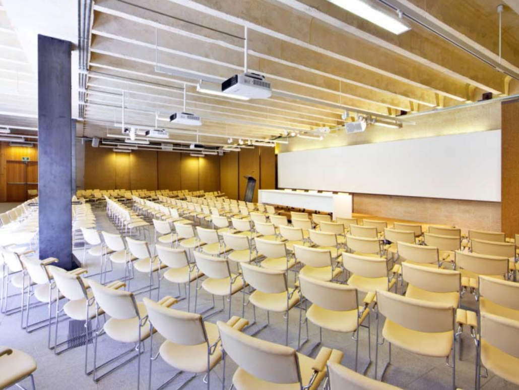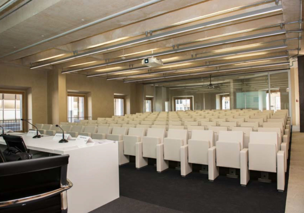 Un espacio multifuncional equipado con proyectores, pantalla, cámaras robotizadas, audio, cabinas de control y de traducción simultánea, wifi, y posibilidad de emisión en streaming, en el que, además, el mobiliario puede adaptarse a las necesidades del acto.