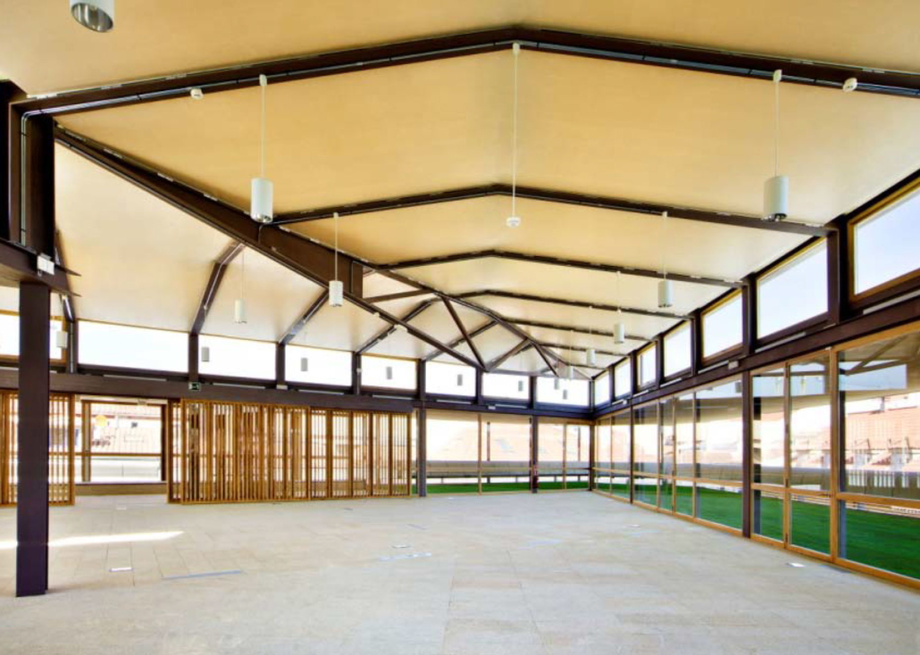 Zona del jardín interior del complejo que se encuentra a una cota inferior a ras de la planta jardín, permitiendo que los actos que se realicen en esta planta se puedan continuar en el exterior con sólo abrir los ventanales que los separan.